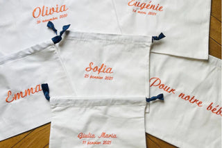 Pour un cadeau inoubliable et une attention toute particulière, vous pouvez faire broder un prénom, une date de naissance ou un petit message sur la face avant du pochon.