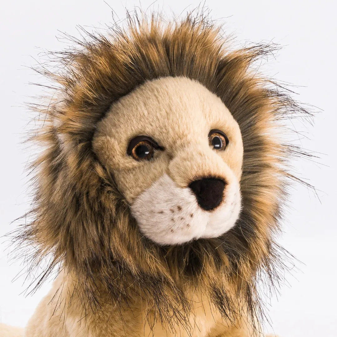 I'm the king of the savannah, Melchior the stuffed lion ! Don't let my majestic appearance fool you, I can also be cuddly and affectionate. In order to give me this regal port, I was made with care by my seamstresses, who neglected no detail, whether it is my bronze-colored eyes enhanced with beautiful leather eyelids, my soft mane more true to life, or my silky coat made by merging three hand-cut fabrics.